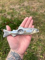 This atlantic salmon (or it could be a steelhead) 😉was made using my custom trout slip cast mold, hand painted in silvers and covered with real mother of pearl. 6.25” long. Easy to clean, glazed inside and out.