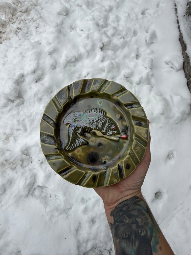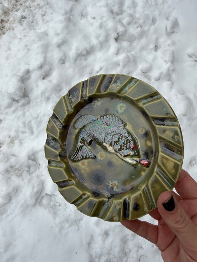 This basshtray was made from a vintage mold, it was hand painted and took a 3rd trip to the kiln for that mother of pearl on the bass. A beautiful green crystalline glaze