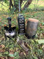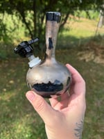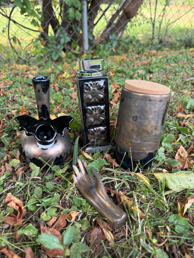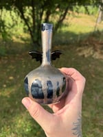 ceramic stoneware water vase with black and gold glazes, glass components (that bat!).