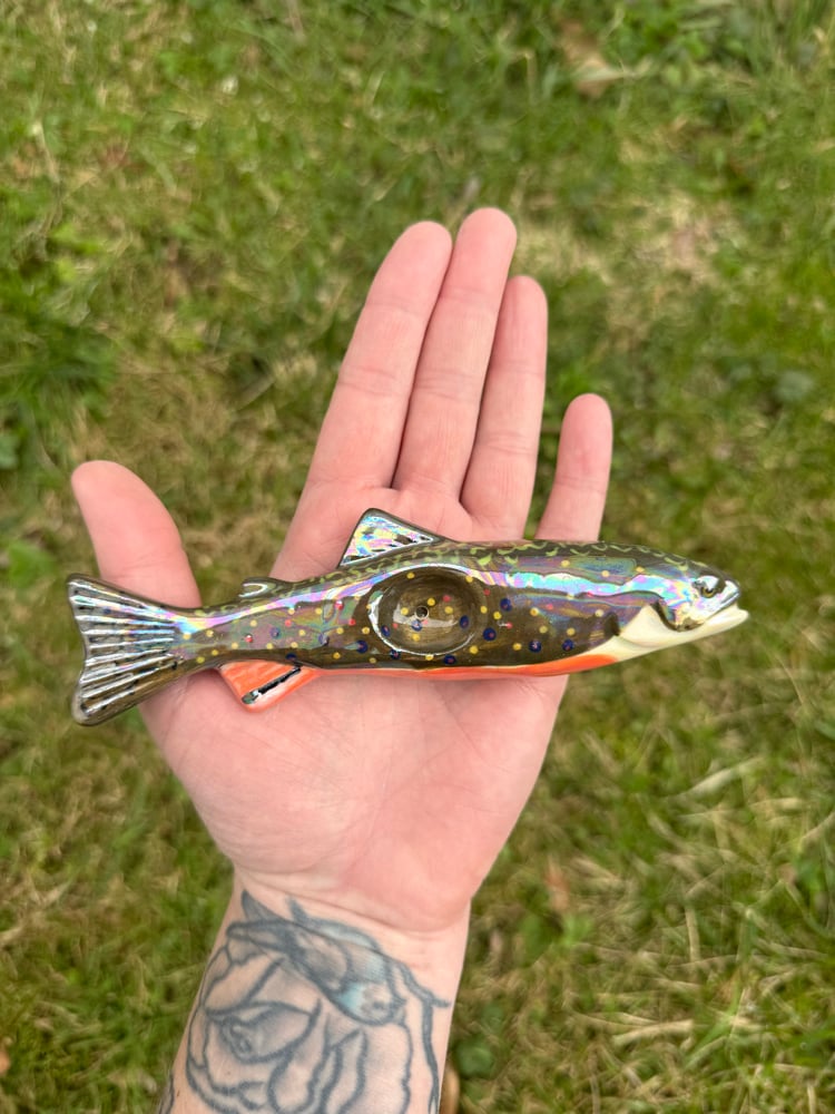 Pre order for a rainbow Trout! These trout pieces were slip casted via a mold that I made. They are hand painted with my custom mix of colors, and fully glazed inside and out. Slight color variations may occur. They are 6.25" long.