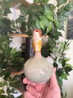 This is a preorder for a brown trout water vase is made of ceramic stoneware with a hand painted trout and glass components. Slight color variations may occur. Estimated ship date is end of April 2026.