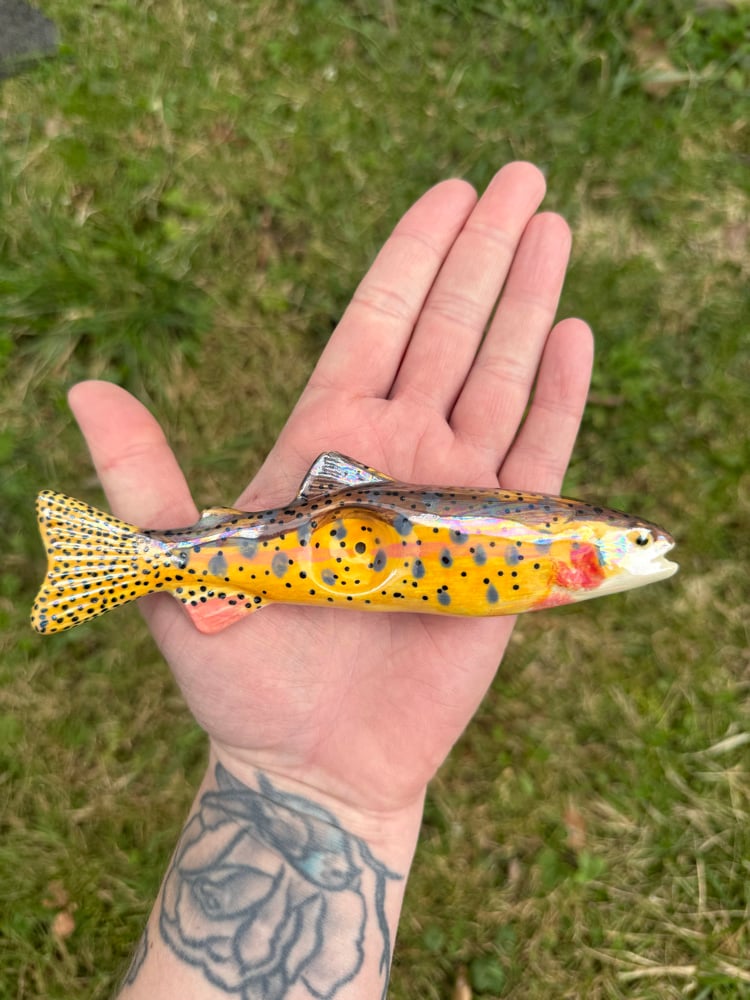 Pre order for a cutthroat Trout! These trout pieces were slip casted via a mold that I made. They are hand painted with my custom mix of colors, and fully glazed inside and out. Slight color variations may occur. They are 6.25" long.