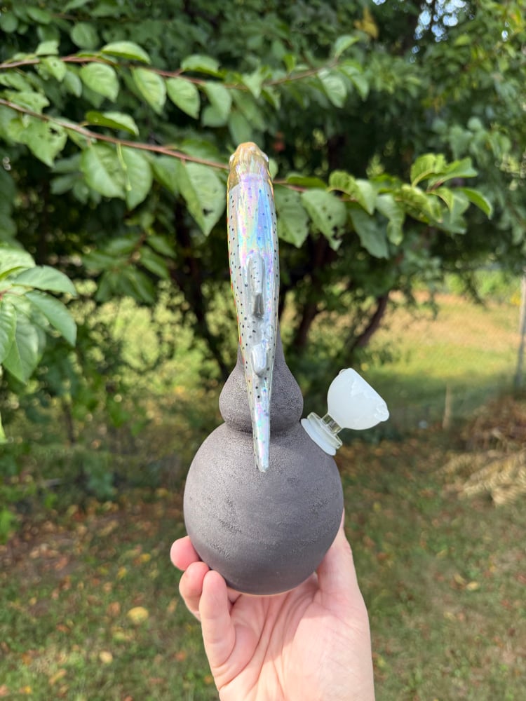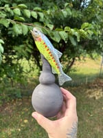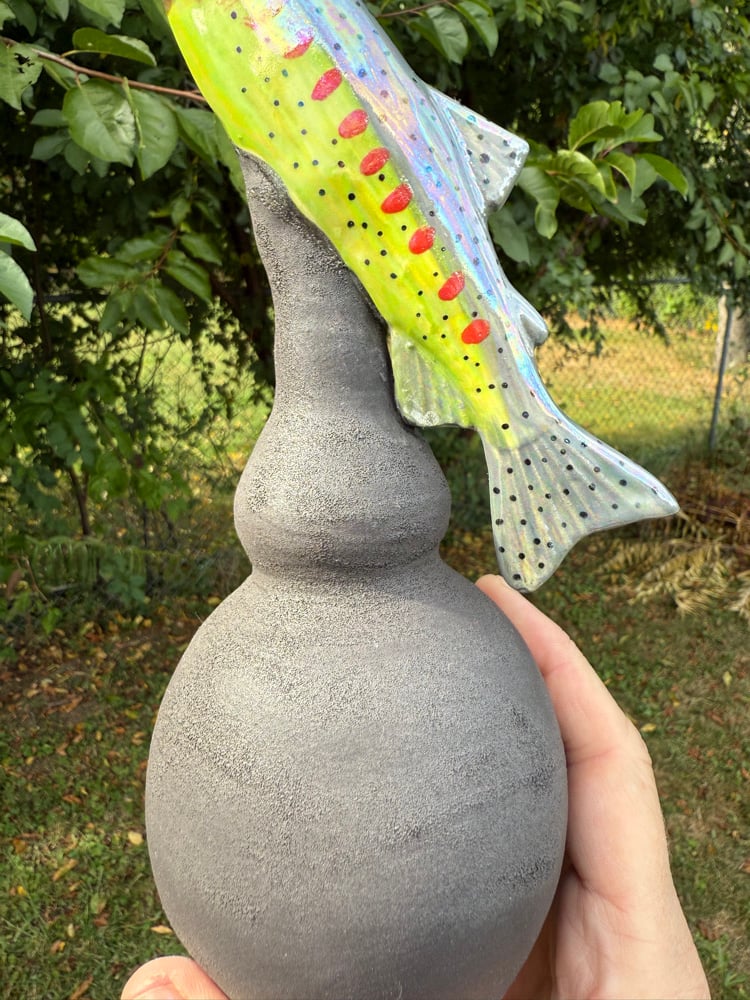 This cutthroat water vase is made from ceramic stoneware with a wheel thrown base and glass components. The trout is hand painted, and covered with real mother of pearl. Easy to clean.
