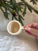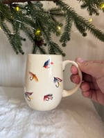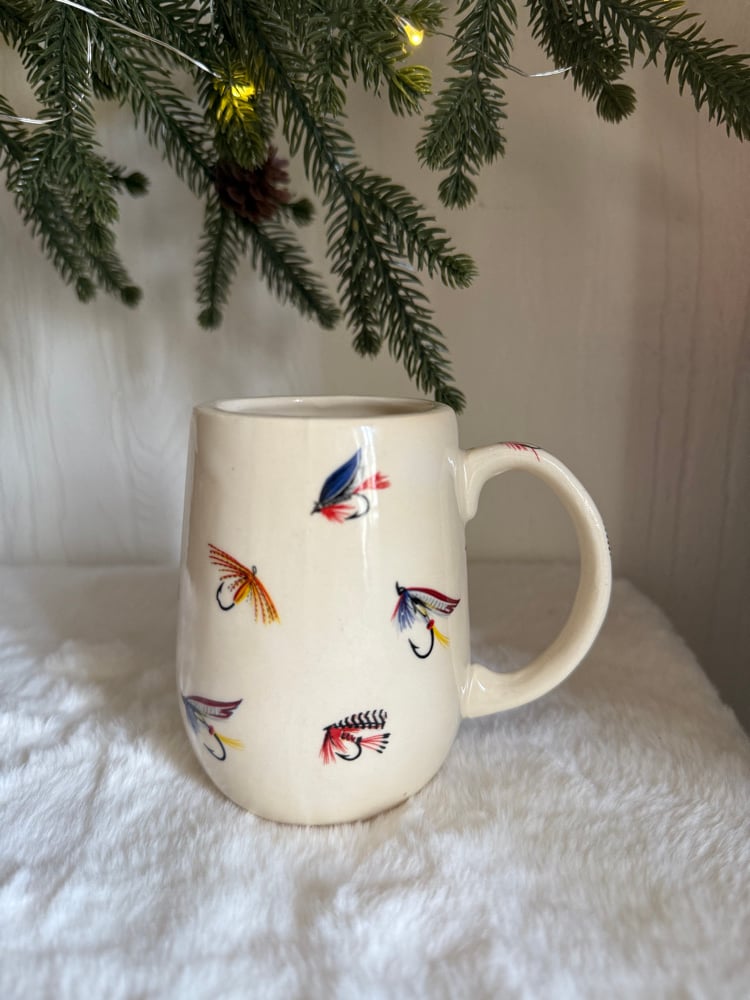 Mug with fly fishing decals. Holds 8oz. Microwave and dishwasher safe but hand wash recommended