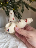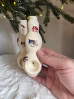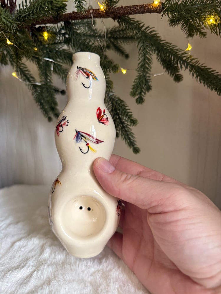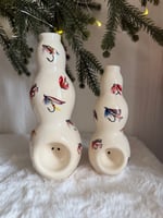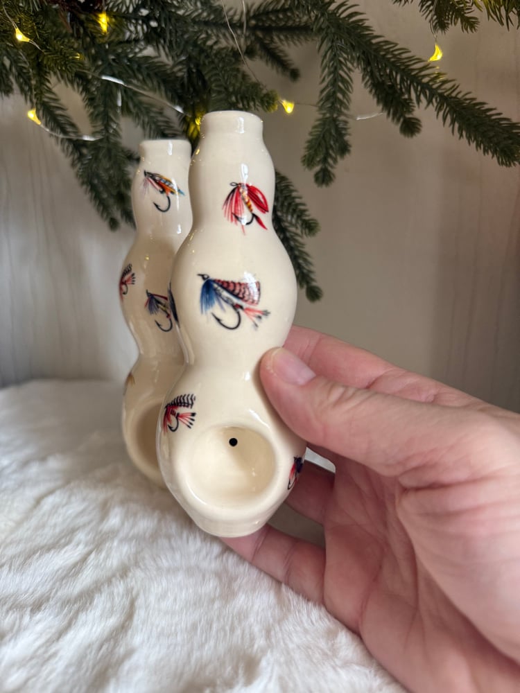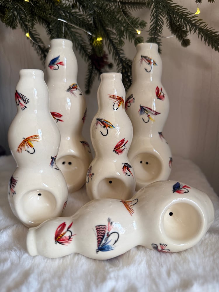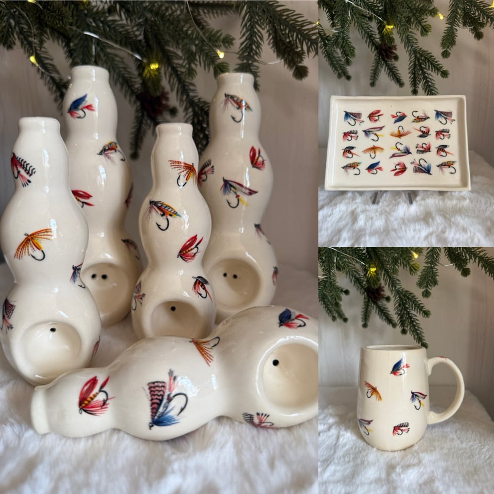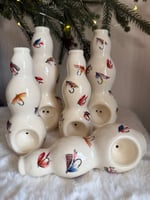 These ‘vases’ are fully glazed inside out and adorned with fly fishing decals! Easy to clean. Stands “ tall