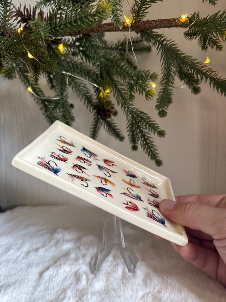 Small tray glazed and covered with fly fishing decals. Roughly “ x “