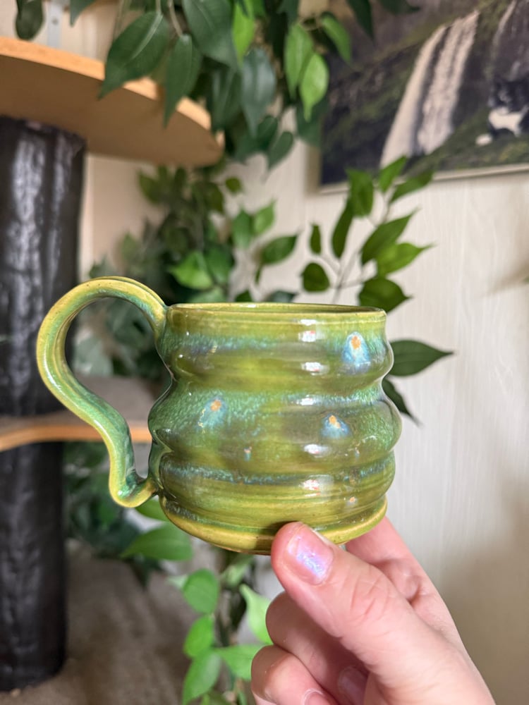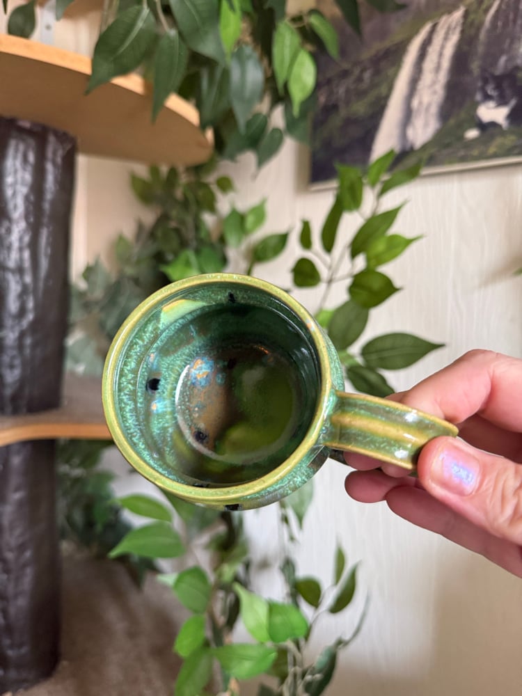 Wheel thrown mug, and I just love the shape and glaze combo! Holds 8oz.