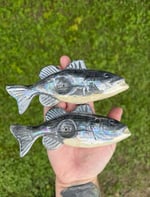 These bass fish were hand painted and have a real mother of pearl glaze for that iridescent look! Each bass is fully glazed inside and out (the pattern only on one side).