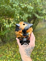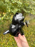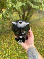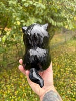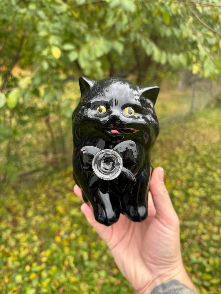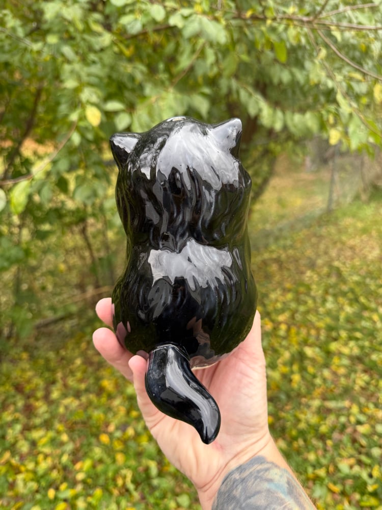These kitties wer made from vintage slip cast molds (with cute little tails). Hand painted, glazed inside and out and fitted with glass components.