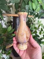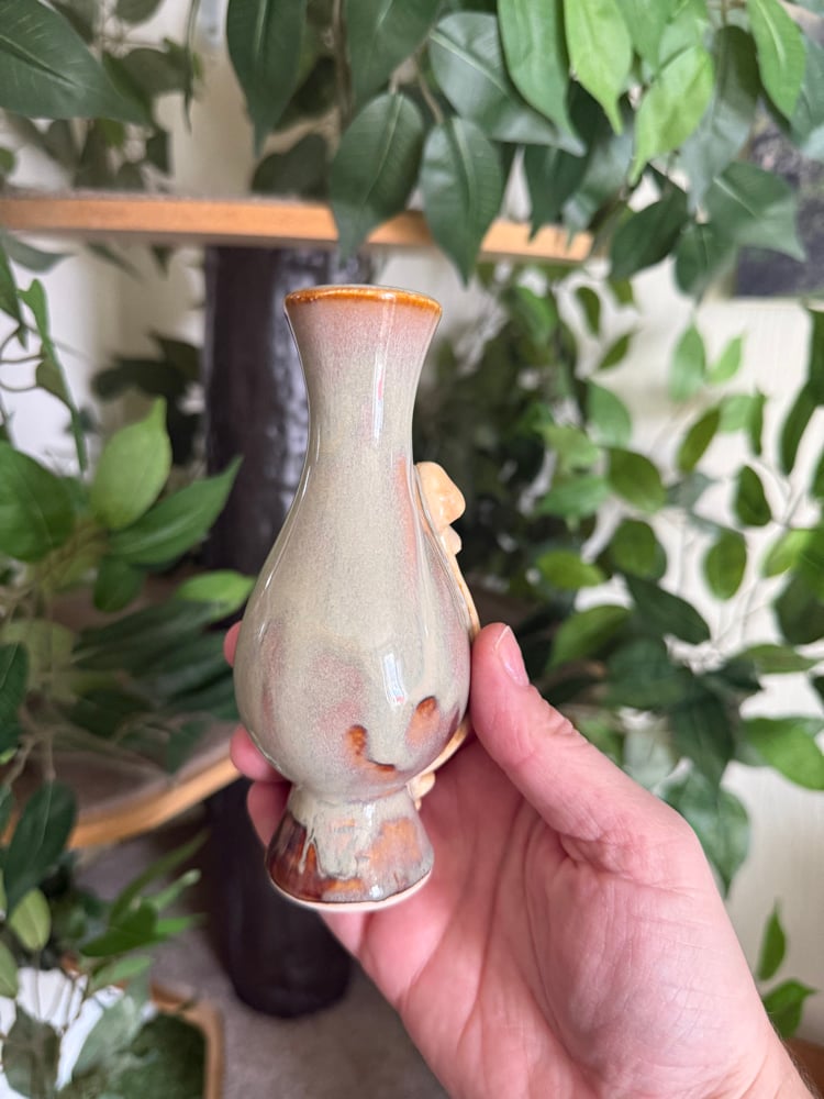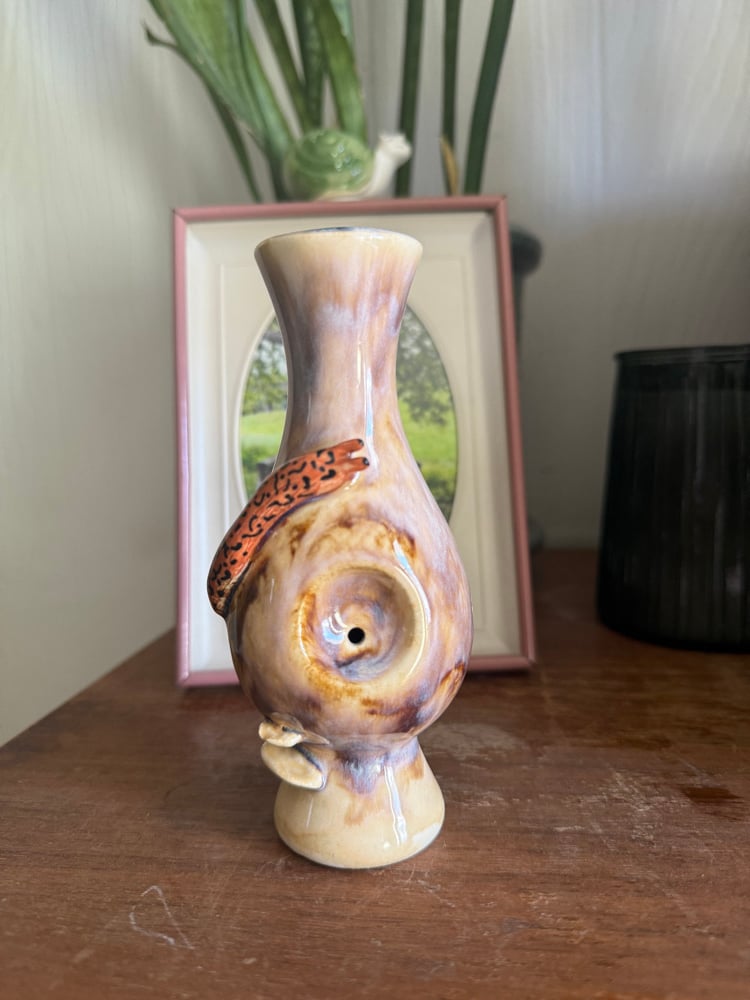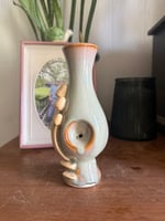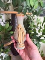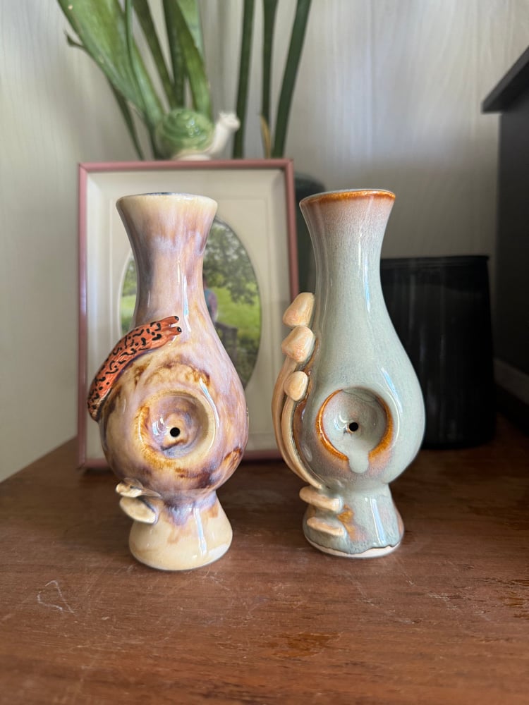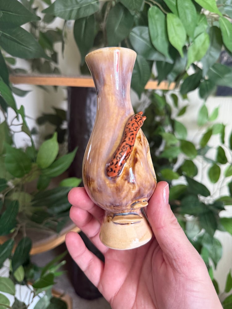 This vase was made from a ceramic slip cast mold, and I hand sculpted mushrooms along the side of one an a leopard slug on the other. Both glazed inside and out, easy to clean!