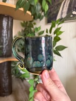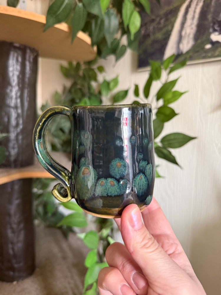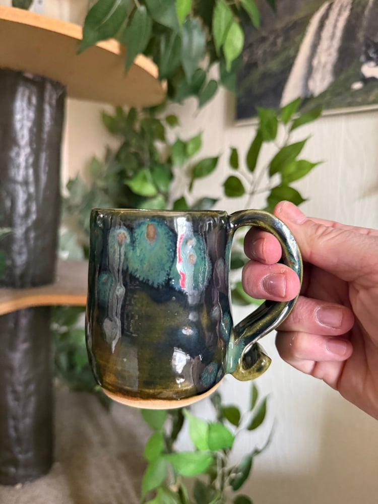 Wheel thrown mug with a olive crystalline glaze. Holds 8oz.