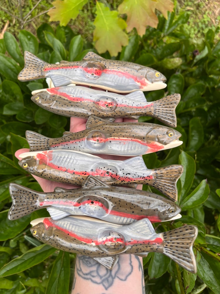 These ceramic stoneware trout pieces were slip casted via a mold that I made. They are hand painted with my custom mix of colors, and fully glazed inside and out. They are 6.25" long and easy to clean.