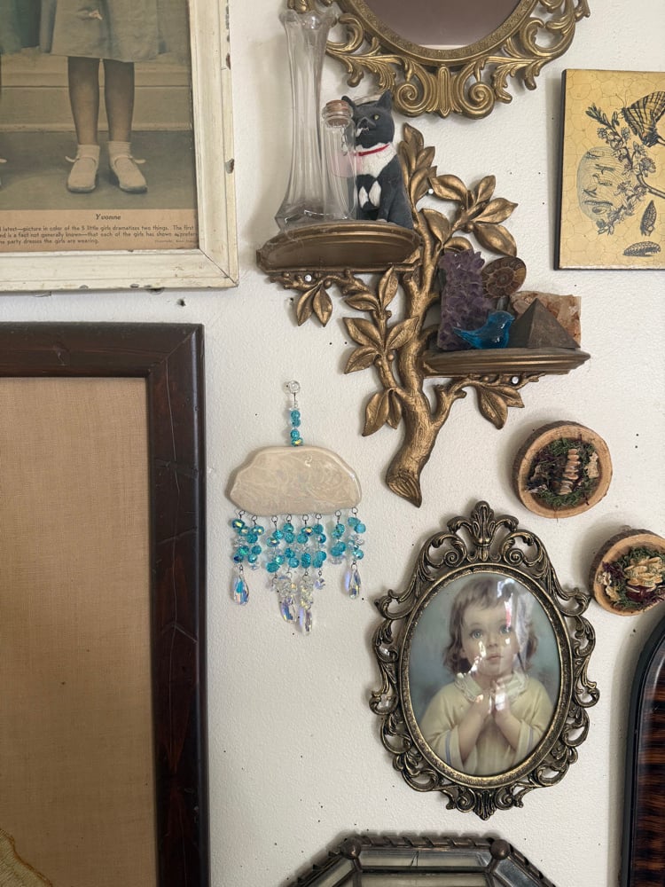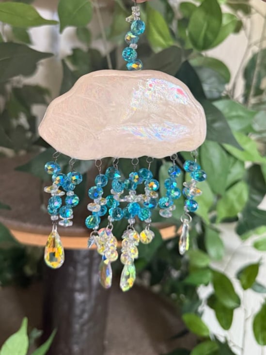 Ceramic cloud with real mother of pearl over glaze and hand beaded rain drops.