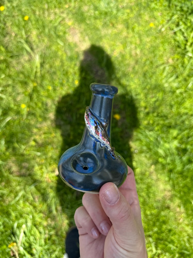 Potion bottle style dry vase with a mother of pearl rainbow trout.