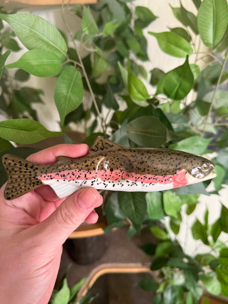 Pre order for a rainbow Trout! These trout pieces were slip casted via a mold that I made. They are hand painted with my custom mix of colors, and fully glazed inside and out. Slight color variations may occur. They are 6.25" long.
