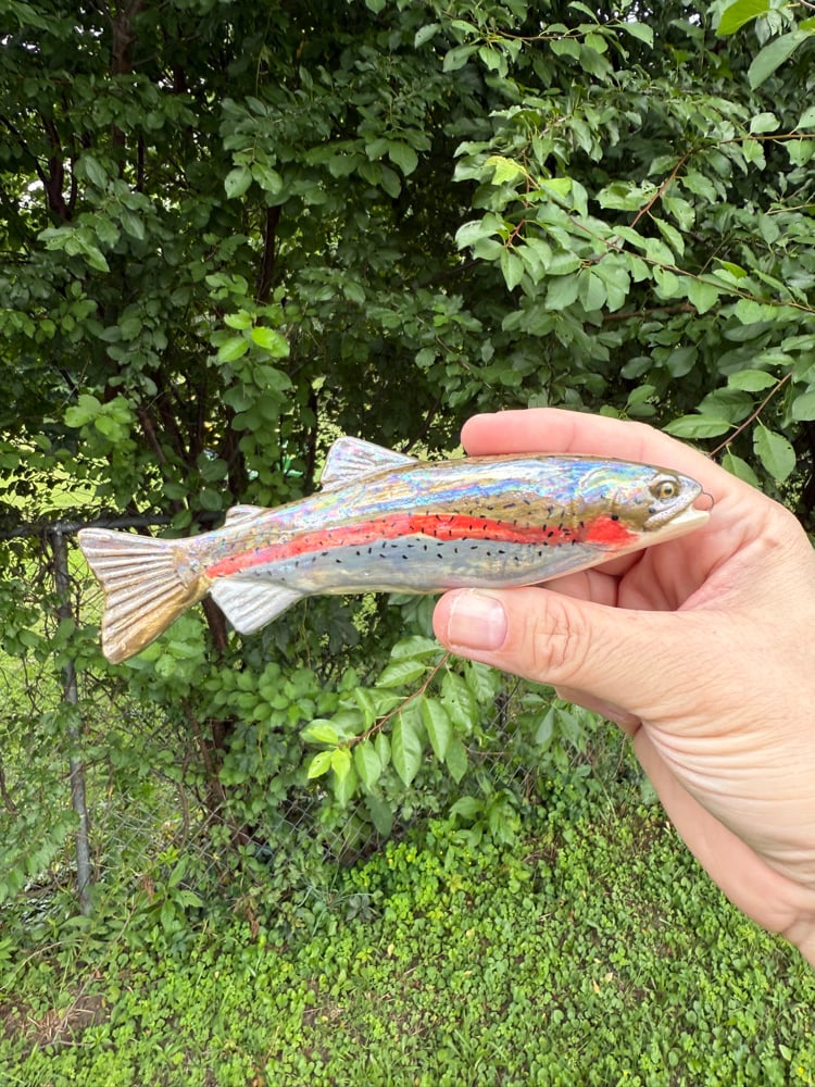 Rainbow trout decor piece! Comes with a Christmas ornament hook. This rainbow trout took a 3rd trip to the kiln for a real mother of pearl overglaze to give that iridescent look.