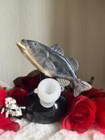 This striped bass water vases was made from vintage vase slip cast molds, my custom bass mold and hand painted. Each one is glazed inside and out, has mother of pearl and all glass components.