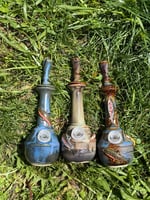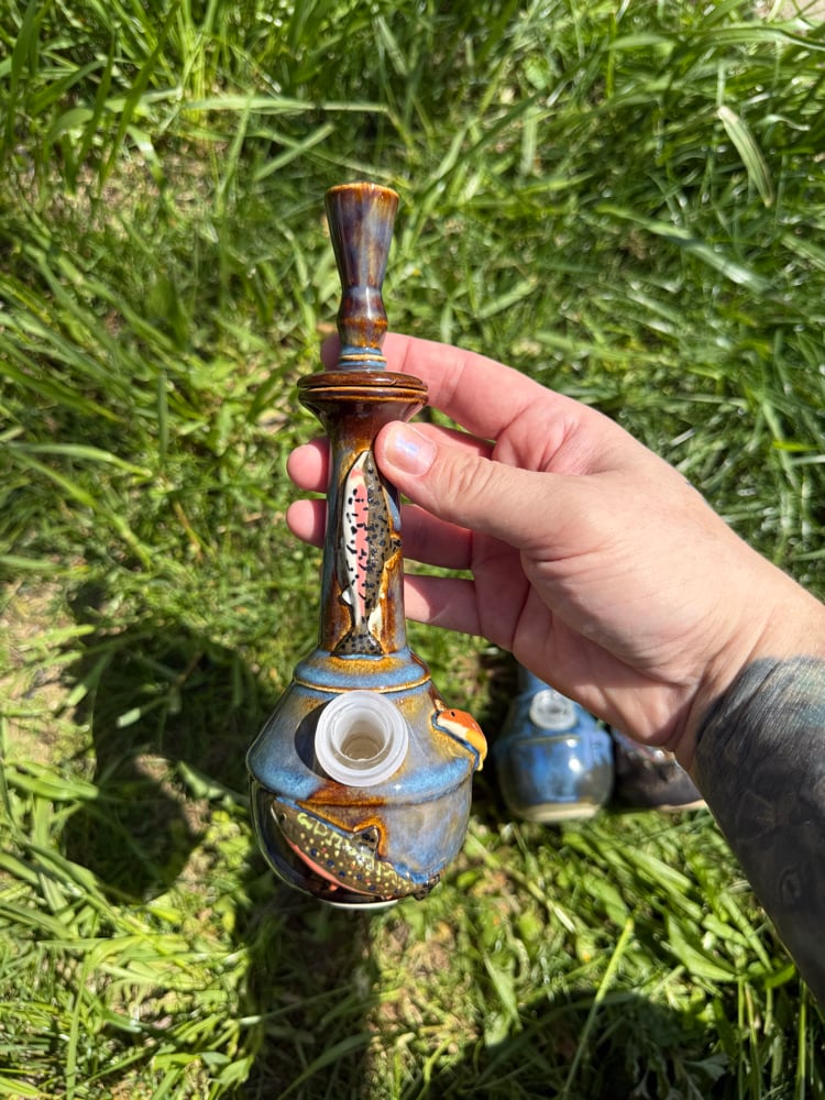 These decanter style water vases have hand painted trout details, glazed inside and out with glass components