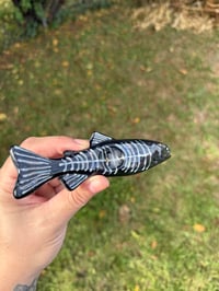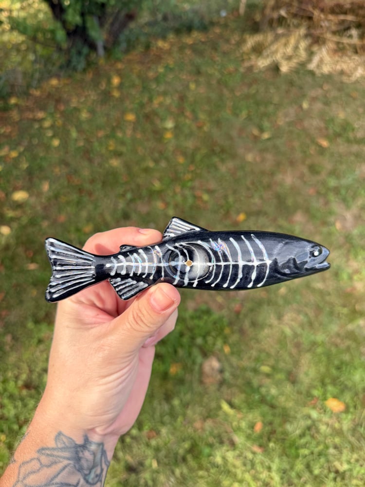 Trout skeleton! My pieces are slip casted via a mold that I made. They are hand painted with my custom mix of colors, and fully glazed inside and out. They are 6.25" long. This skeleton has real mother of pearl on the white lines.
