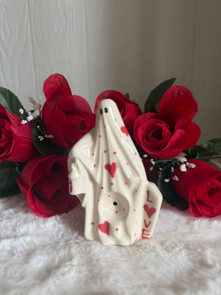 Sometimes Cupid needs help, and these valentine ghosts stepped up! handed painted details, glazed inside and out.