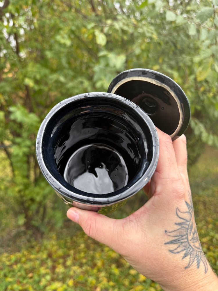 This lidded jar is part of a vintage 1960s zodiac themed smoke set. This “urn” is fully glaze inside and out (it is not air tight). About 4” tall.